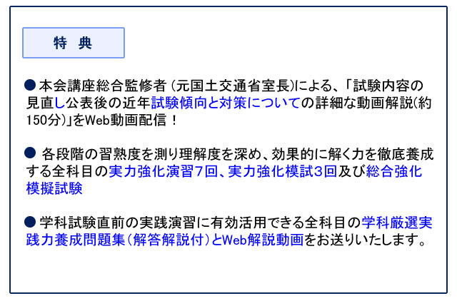 本会講座総合監修者(元国土交通省室長)による、「試験内容の見直し公表後の近年の試験の傾向と対策についての詳細な解説(約150分)」のWeb動画からスタート!
