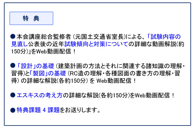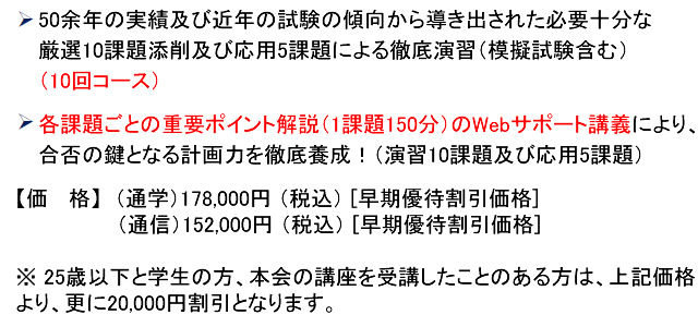 ●一般的に法規と構造を不得意に感じる方が多いため独学やWスクールの方にも有効な、法規と構造の基礎から応用まで、集中的に補強し、身に付けたい方のための特訓コースをご用意しました!