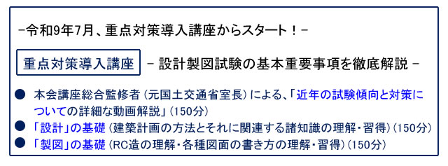 全科目の重点ポイントを徹底解説した集中講座(計13回、1回3時間合計39時間)で、特に準備に時間を要する「法規」と「構造」に重点を置いた講座です。